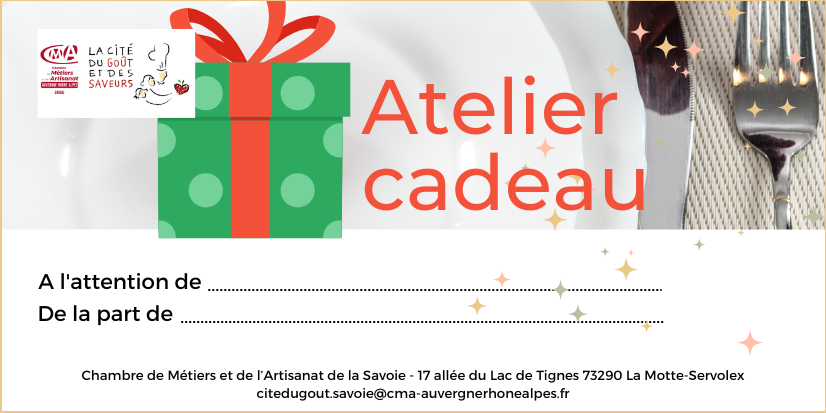 Pour offrir un atelier culinaire, il suffit de cliquer sur l’atelier de votre choix puis de cliquer sur « s’inscrire » et de remplir les champs coordonnées en mettant vos propres informations mail et n° de téléphone et vous pouvez télécharger ci-dessous une carte cadeau à imprimer :